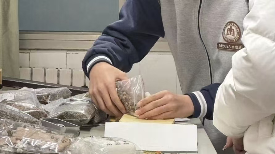 中药科普与香囊DIY环节深受学生欢迎。团队成员系统讲解薄荷、金银花等常见中药的功效与气味特征,以双语标注核心功用;随后开展“嗅香识药”趣味互动,学生踊跃上台闻药辨名,用中英双语回答药材功效,现场气氛热烈。香囊DIY环节中,三位学生代表在团队指导下体验称量、研磨、混合药材全过程,了解清新提神、静心安神、辟秽健脾三款香囊的药材配比,亲手制作专属中药香囊,在实践中感受中医药文化魅力。