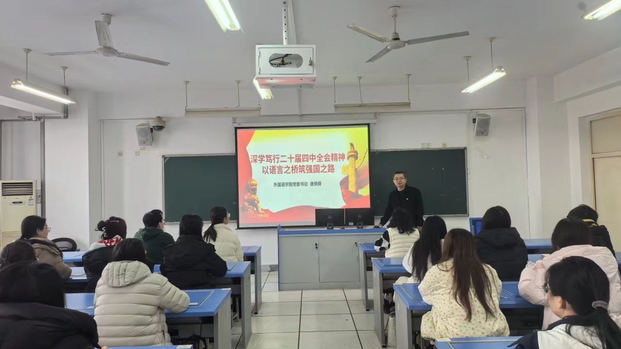 实际和外语专业特色,从历史维度、国际维度、青年成长维度解读全会的重大意义,从坚持党的全面领导、高质量发展、对外开放、教育科技人才一体化、人民至上等五个方面把握全会精神的核心要义。唐炳舜强调,党的二十届四中全会与青年学子的成长成才息息相关,青年一代既是国家发展的见证者,更是民族复兴的生力军。外语专业的学生肩负着讲好中国故事、传播中国声音的时代使命,要将个人理想融入国家发展大局,在学好专业知识的同时,深刻理解全会精神中关于“坚持对外开放”“人民至上”等重要论述,努力成为具有家国情怀、专业素养、全球视野的复合型外语人才。他鼓励学生干部要发挥先锋模范作用,带头学习、带头宣讲、带头实践,以实际行动影响和带动身边同学,把全会精神转化为勤奋学习、练就本领的强大动力,以服务社会、报效祖国的实际行动,奋力书写挺膺担当的青春华章。